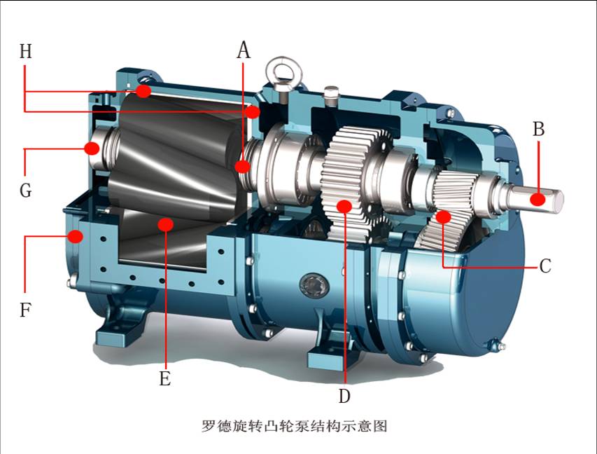 A—機(jī)械密封;B—軸;C—減速齒輪;D—同步齒輪;E—轉(zhuǎn)子;F—快開式泵蓋;G—軸承;H—耐磨襯板